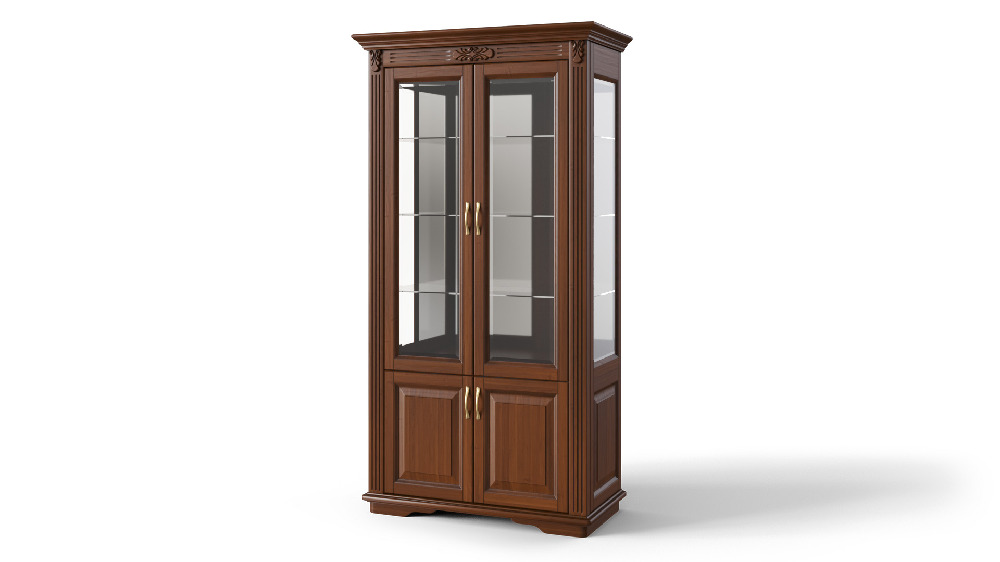 Одностворчатые, двухстворчатые и трехстворчатые витрины для гостинной «Палермо», изготовленные из массива бука или ясеня со стеклянными боковыми стенками и фасадами рамочной конструкции со стеклом, обработанным фацетом. Витрина имеет четыре стеклянные полки, задняя стенка имеет в своей конструкции два соединенных зеркала, которые делают интерьер более легким и изысканным. В базовой комплектации витрины оснащаются выкатными ящиками или опционально под заказ - распашными створками. Изысканная классика — вот стиль витрины и интерьера «Палермо».
